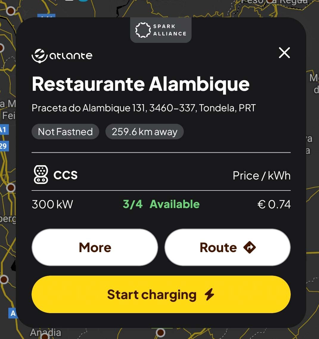 Nesses postos o preço Fastned é muito mais baixo que o preço MyAtlante. Em Tondela são postos de 300kW que na Fastned são 24cts, na MyAtlante 65cts.