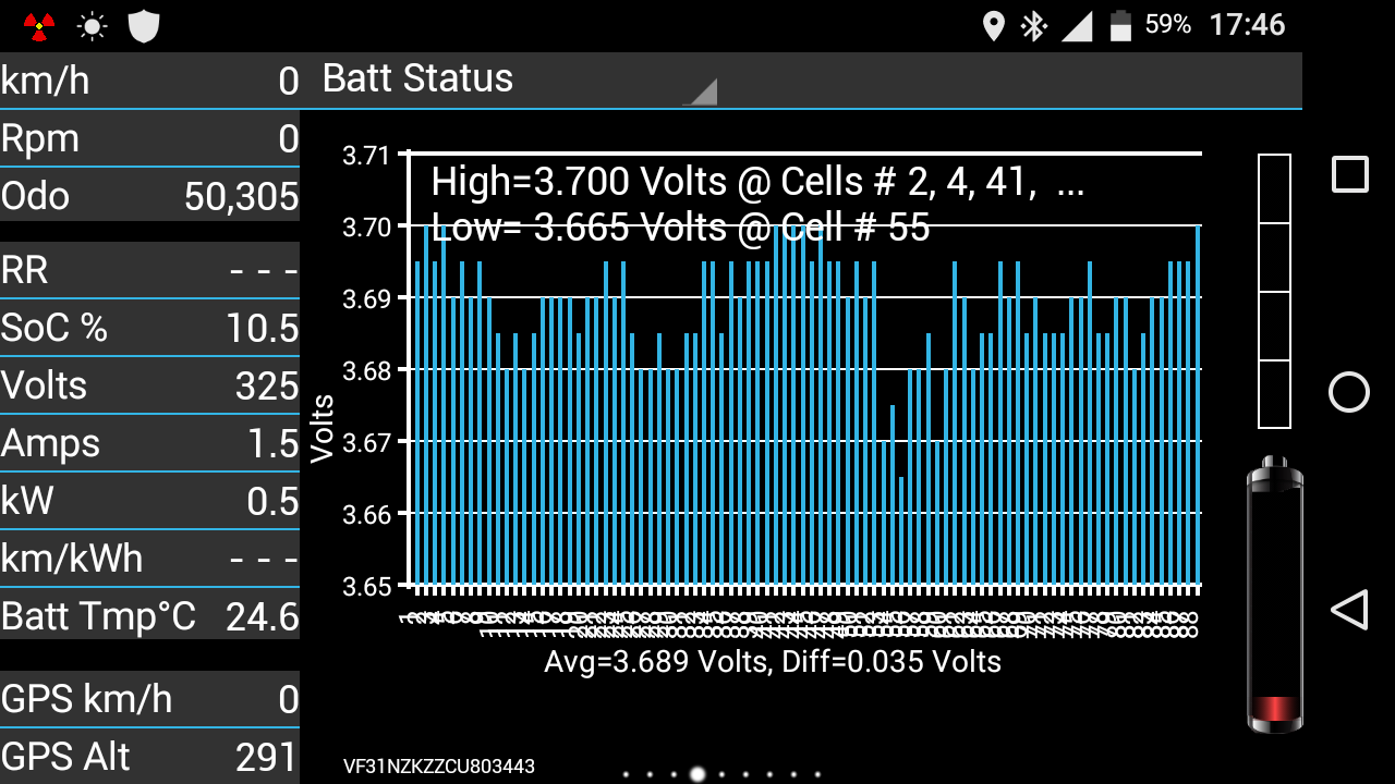 Neste momento o screenshot mais recente que tenho é do carro com 6.5% SOC, onde tenho cerca de 90mV de diferença entre a célula mais baixa (nº 67) e a mais alta. Assim mais perto desse SOC tenho uma imagem de há quase um ano atrás com 20mV de diferença a 9% SOC.