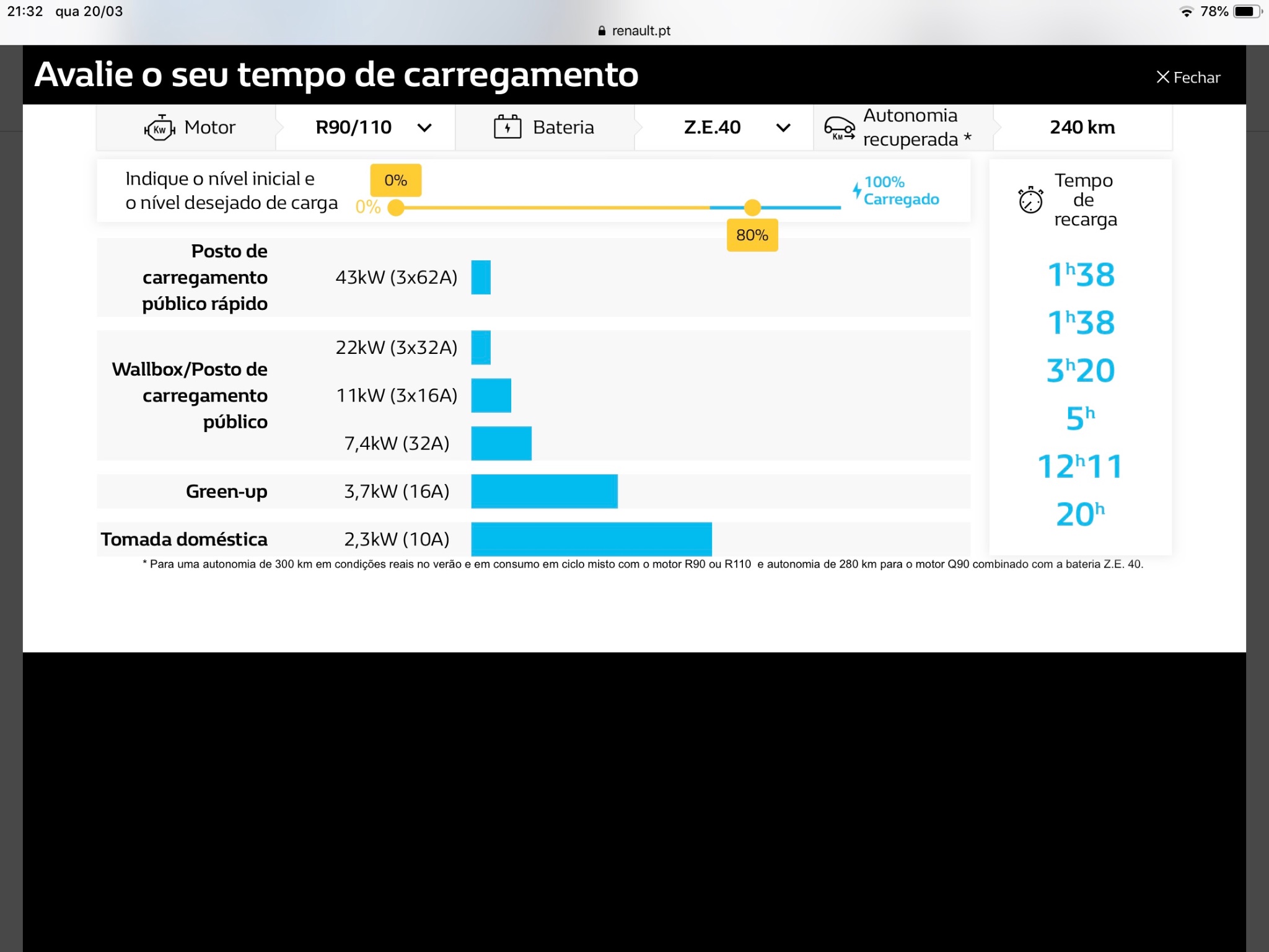 Quanto aos 22kWh tem de ter rede trifasica, o carro tem de suportar esse tipo de carregamento. Como já referi não é a tomada que faz milagres.