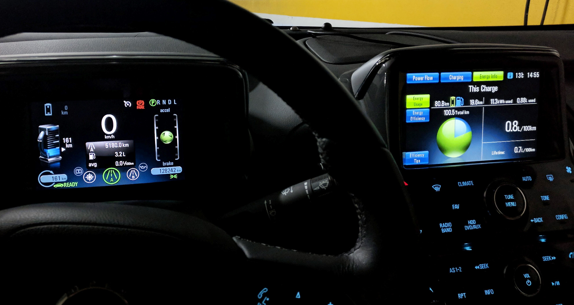 Esta foto, tirada no final de um passeio Odivelas - Arrábida - Odivelas, talvez te ajude a perceber melhor o conceito de um PHEV. Fiz 80.8km em modo 100% eléctrico. Como obviamente não pude carregar na Arrábida usei 0.88l de gasolina para poder chegar a casa. Como também podes ver no painel de instrumentos, nos últimos 5180km foram gastos 3.2 litros de gasolina no total (0.06l/100km).