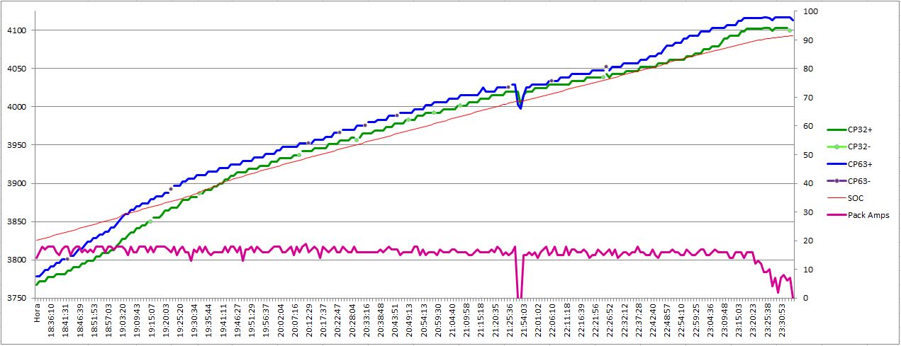 ... Carregava até 80%,85%,90% e 95%+ (carga a "100%") de SOC, deixando repousar 30 minutos em cada uma com o carro desligado. Após esses 30 minutos ligava o carro em modo ACC (sem o contactor da bateria atracar) e registava as tensões das células,