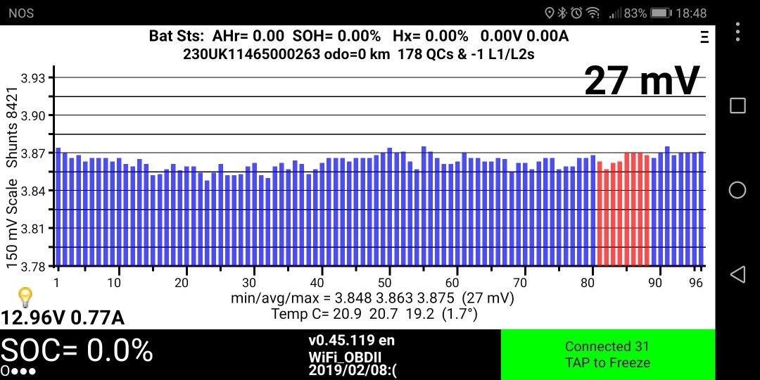 Em última análise o que conta é a tensão na célula mais fraca, mas os kW.h indicados pelo Leaf Spy são um bom indicador da capacidade restante, especialmente porque o Leaf vai ajustando esse valor com a tensão das células. O valor da tensão mínima varia muito mas é entre 2,5V e 3,0V na célula mais fraca. A tartaruga aparece normalmente por volta dos 0,2kW.h de energia restante, mas pode aparecer mais cedo...