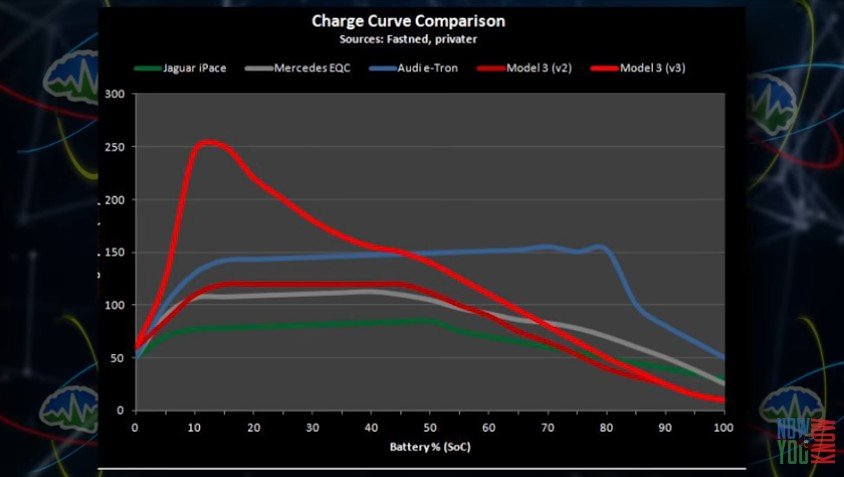 Vejam a curva de carga do Audi a azul, completamente diferente do resto dos outros EV's. Os autores do video referem que há o receio de ter sido uma decisão administrativa ter o pack de baterias a carregar a 150kW até cerca de 80%, e que com isso a longevidade da bateria seja comprometida.