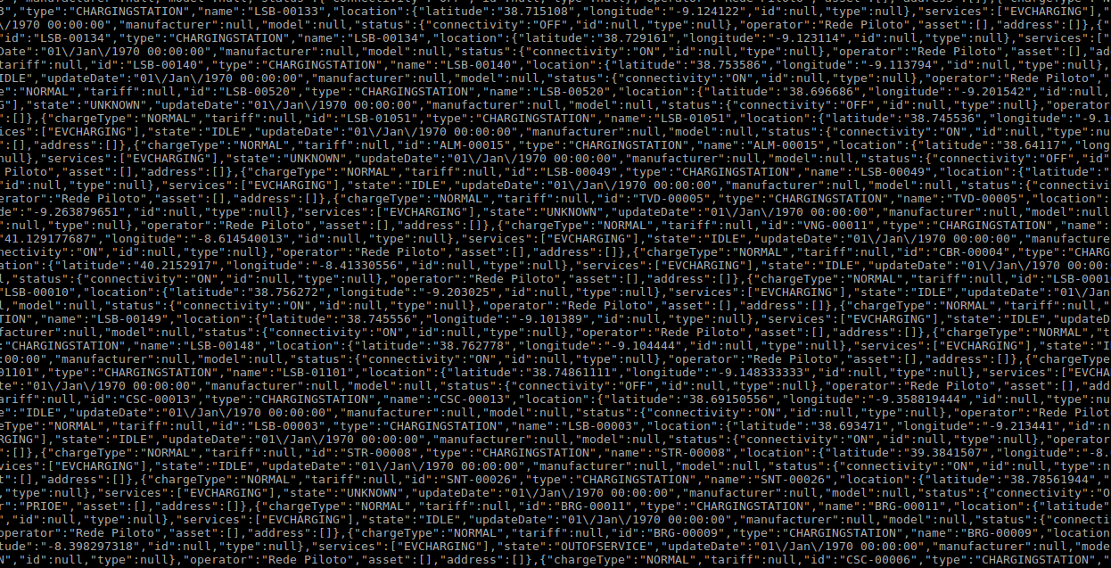 (...){"id":"LRS-00031","type":"CHARGINGSTATION","name":"LRS-00031","location":{"latitude":"38.783417","longitude":"-9.111183","id":null,"type":null},"services":["EVCHARGING"],"state":"IDLE","updateDate":"12\/Jun\/2017 19:37:59","manufacturer":"EFACEC","model":"Efapower EV C1","status":{"connectivity":"ON","id":null,"type":null},"operator":"EDPMOP"}(...)