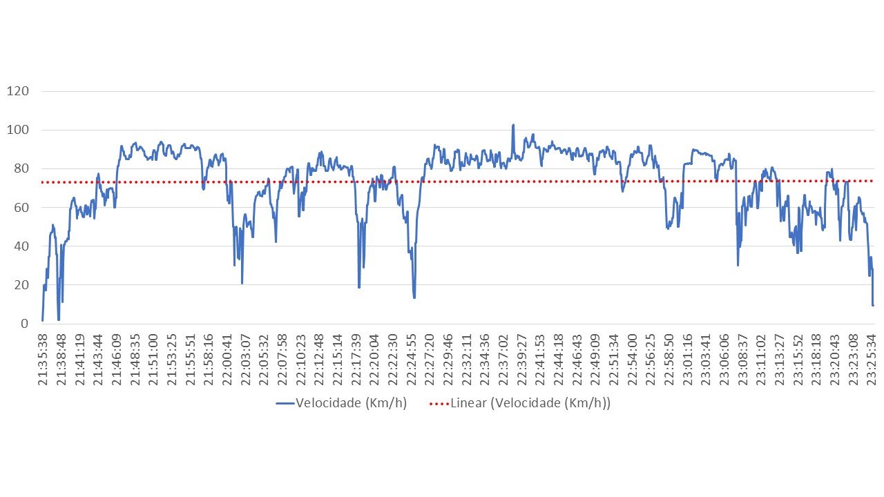 A duração da viagem foi de aproximadamente 1H50 (mais 5 minutos do que indicado pelo maps), e teve inicio às 21h35, e terminou às 23h25.