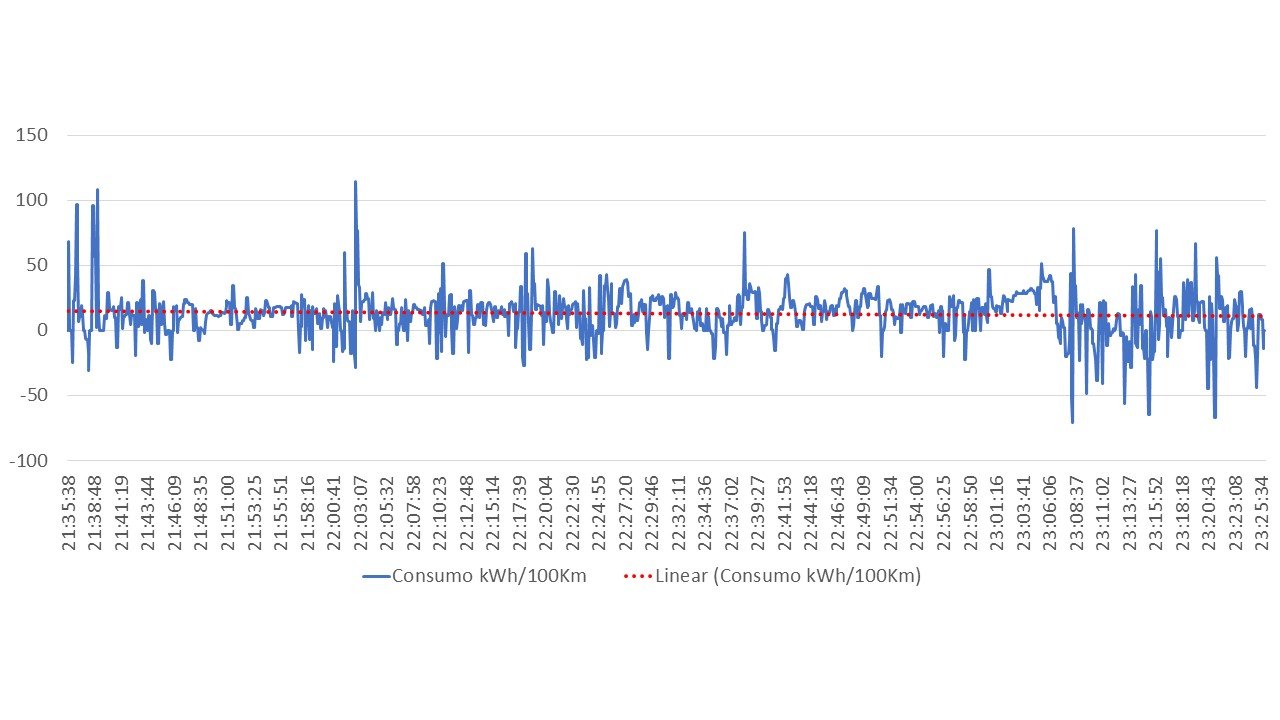 O consumo médio foi de 13,9 kWh/100km, e a velocidade média 72,1 km/h, tendo sido consumidos 18kWh.