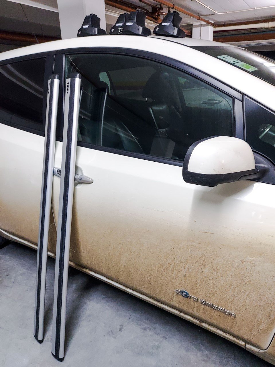 A "meia prenda" foi um conjunto de pés e barras Thule que chegaram para o combustão cá de casa: São aplicáveis também no Leaf, sendo que agora necessito caçar a referência já descontinuada do apoio: 1633.