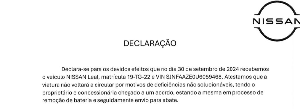- 30 de setembro 2024 entregue a Nissan ao abrigo da garantia para abate.
