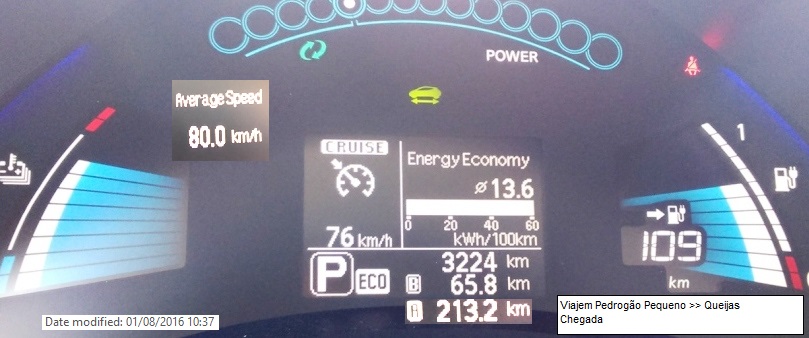 A distância prevista era 144 KM - teoricamente sem problemas. Mas na A13 e principalmente na IC8 há descidas e grandes subidas. Por isso tentou-se não ultrapassar os 90KM/hora (100 nas descidas). E um LS: A viajem sem Aveiras (carga rápida) não era prática. Com Aveiras é perfeitamente aceitável.