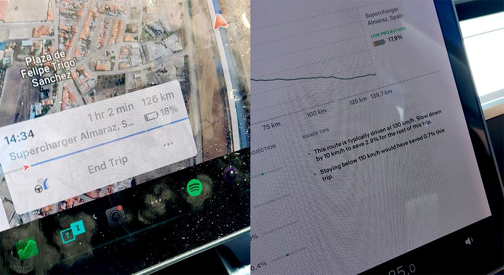 Primeira paragem em Manzanares com calor intenso e chegada com média novamente superior a 123km/h (estes troços são super rápidos, fui mais ultrapassado do que ultrapassei!) e 17,2. Talvez por ter consumido mais do que o previsto, o carro exigiu um carregamento maior e além da paragem em Mérida também já pedia em Montemor.