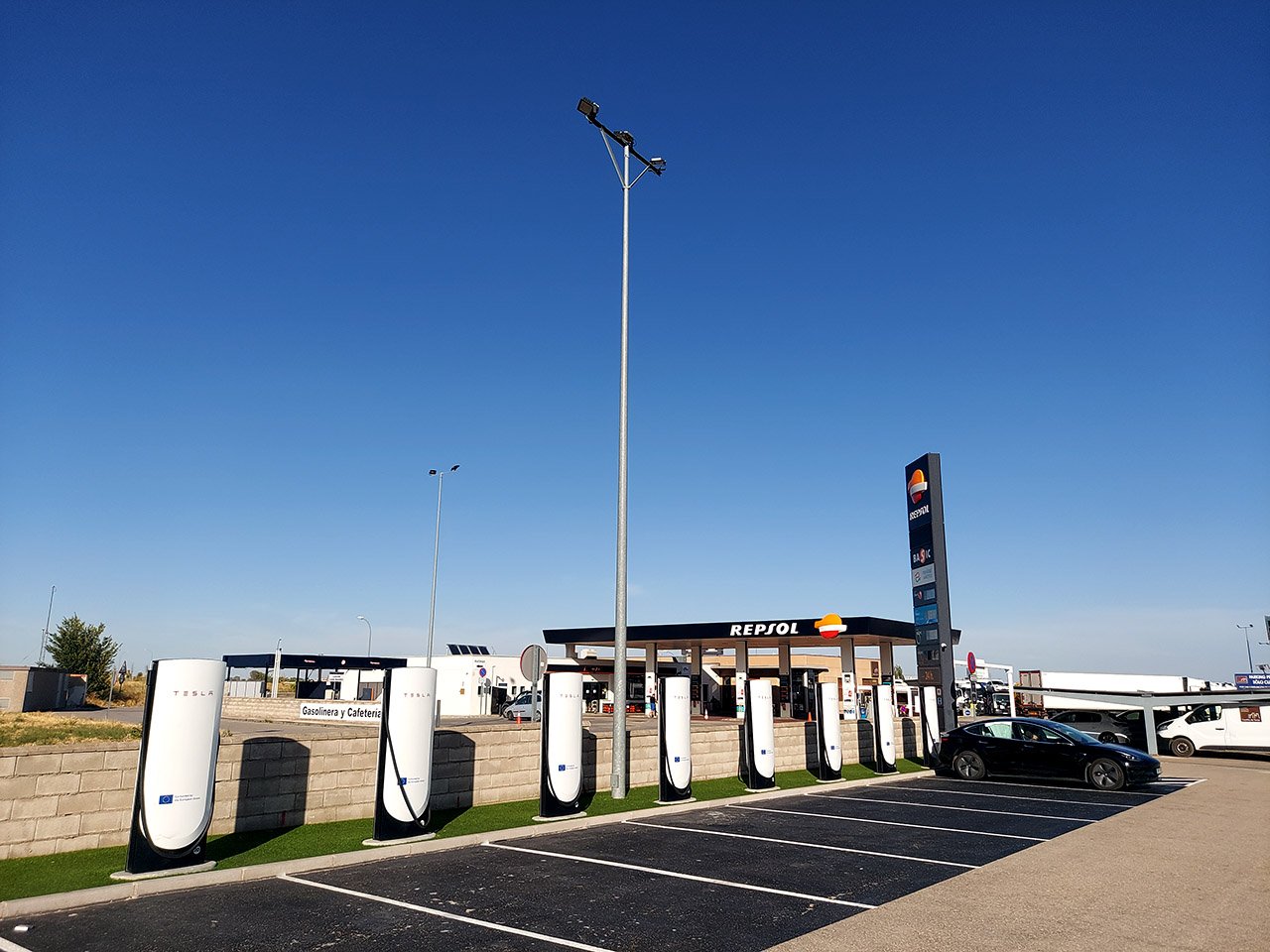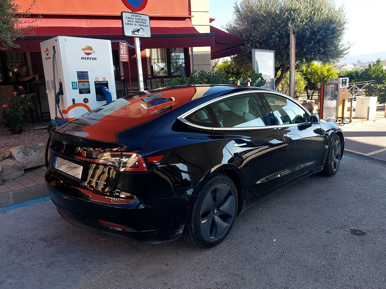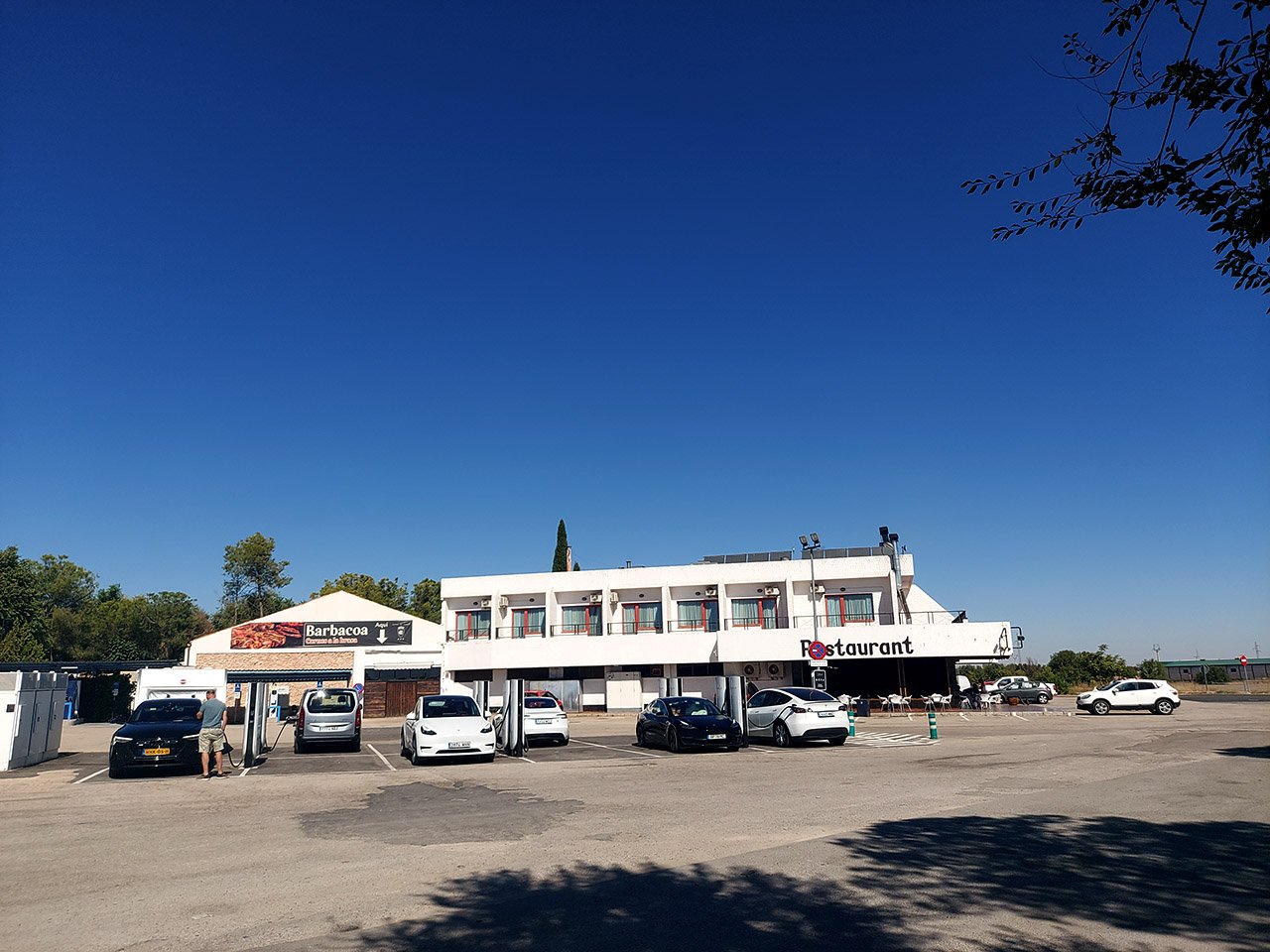 Saída até Torija em modo sem paragem, feitos 280km a 17,0/100 e novo carregamento curto de meros 16 minutos, sempre a torrar ao sol. Depois de ver fotos dos novos SUC e outros HUBs em França e nos Países Baixos, fica sempre um amargo de boca estes postos Espanhóis sem uma cobertura sequer e sem grandes comodidades. :D