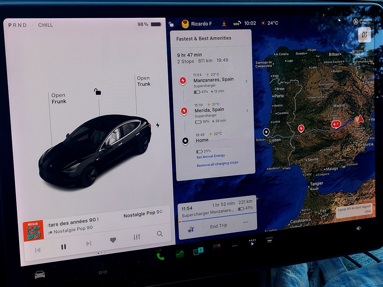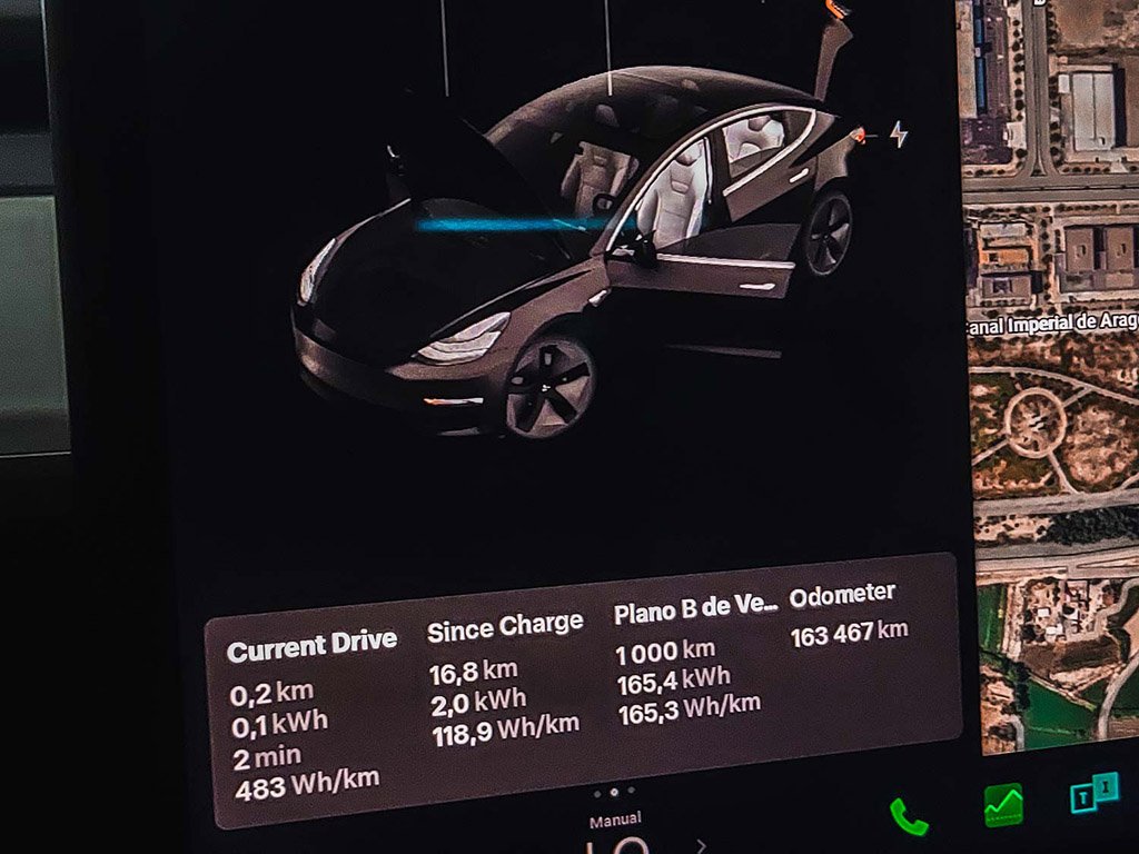 Primeiro carregamento em Mérida após viagem com paragem em Montemor para um pequeno almoço, previsão de 26% na APP mas o carro chega com 12%. Não é difícil de perceber, a mala vai cheia, a frunk ainda mais, no lugar do pendura vão duas mochilas aos pés, e entre as cadeiras dos miudos vai um saco e uma mochila no chão. O cabo de carregamento viaja por baixo do meu banco aos pés do mais velho, e o outro lado também vai com alguma tralha: Em resumo, o nosso Model 3 nunca viajou tão pesado, e a estimativa deve ter assumido as médias anteriores.