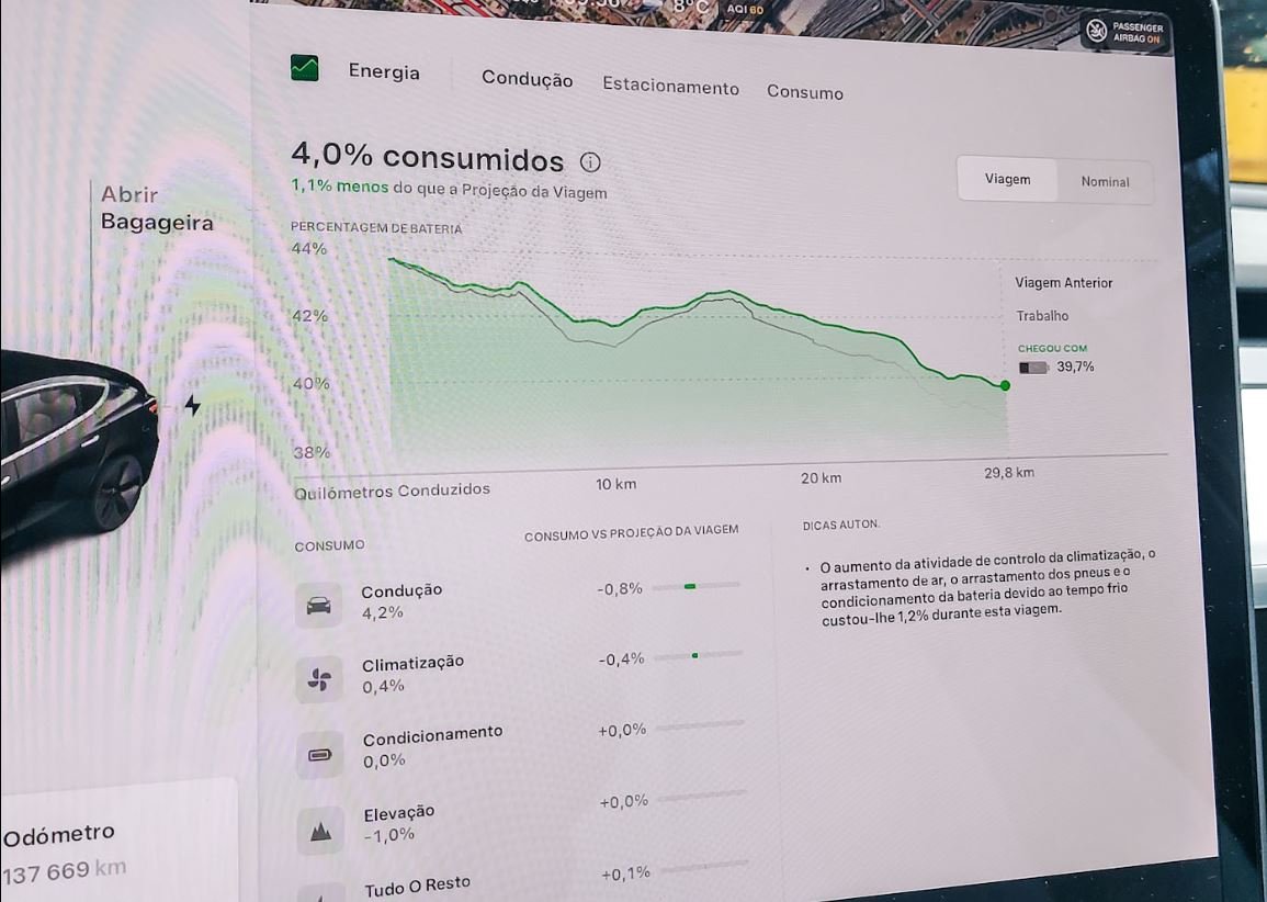 O carro continua na sua nova vida, com estes parciais simpáticos até ao emprego. Curiosamente em grandes descidas o carro assume sempre que vou recuperar mais energia do que aquela que efetivamente recupero, perco sempre ali qualquer coisa no estimado.