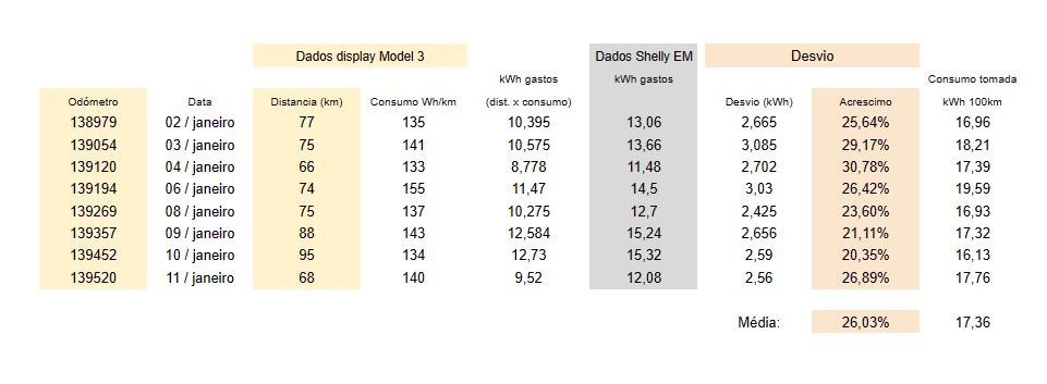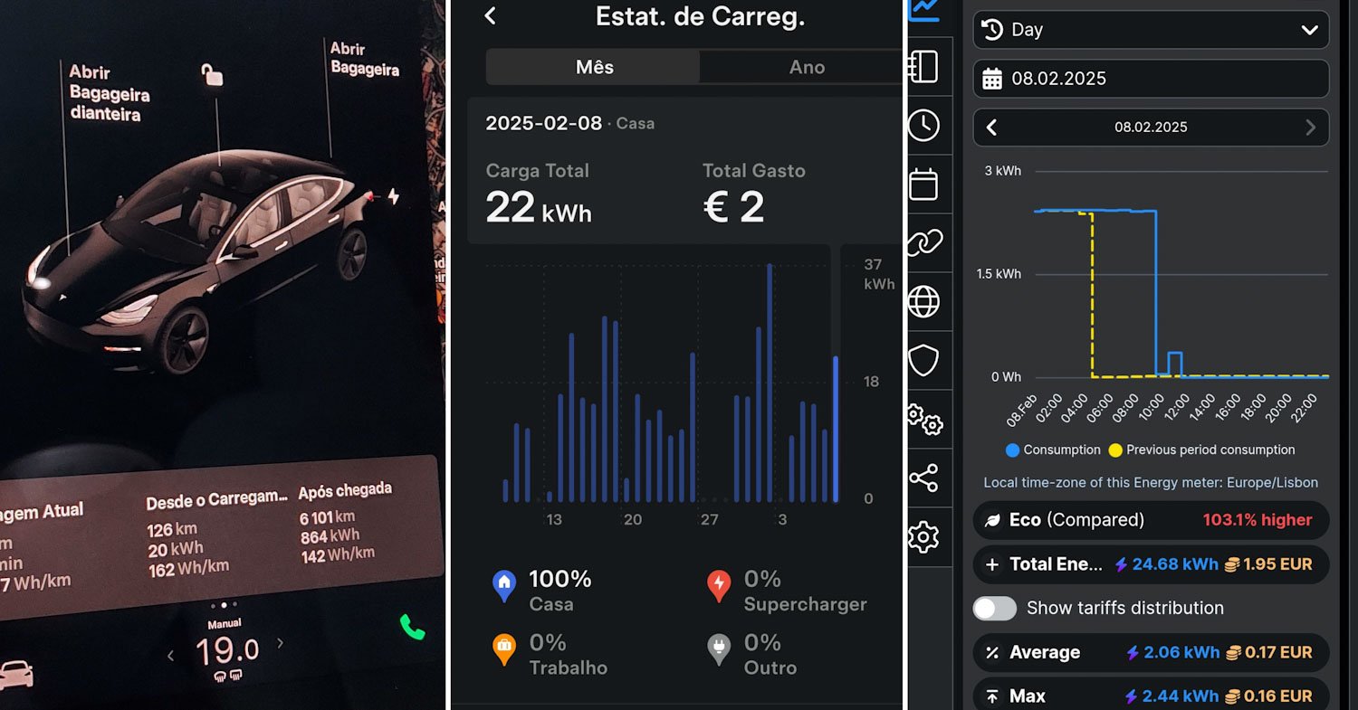 Ontem pelos dados indicados de viagem consumi 9,52 kWh, segundo a aplicação Tesla hoje carreguei 11 kWh, e segundo o Shelly foram consumidos 12,08.