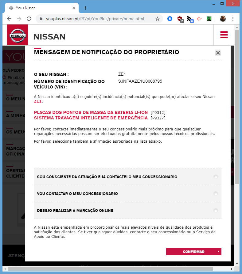 Recebi hoje uma carta registada da Nissan Ibéria por causa do sistema de travagem, para agendar uma intervenção para actualizar o software. Agora fui ver ao site outra vez e já me apareceu a mensagem que falam aqui.