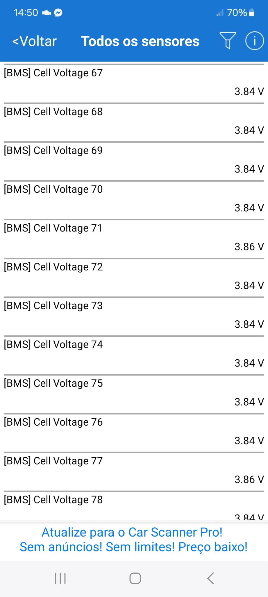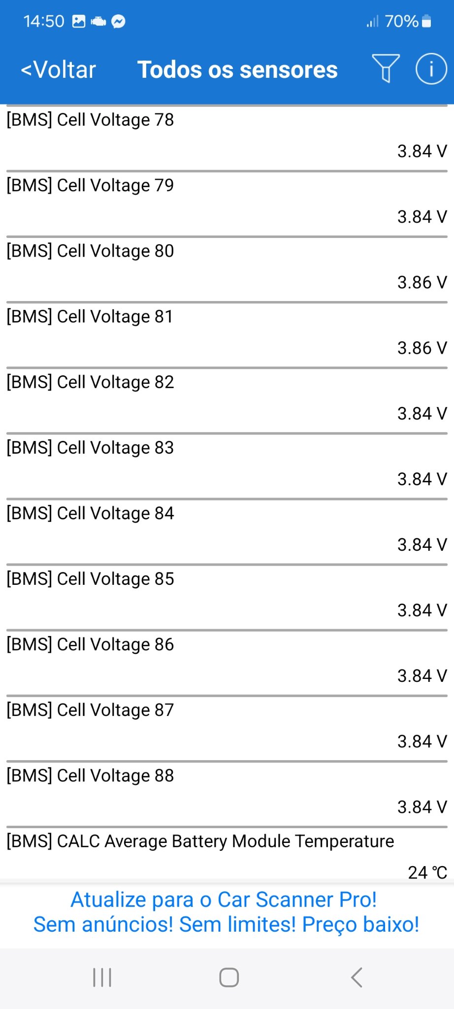 12 células oscilava entre os 3.84V e os 3.86V e as restantes estavam fixas nos 3.84V