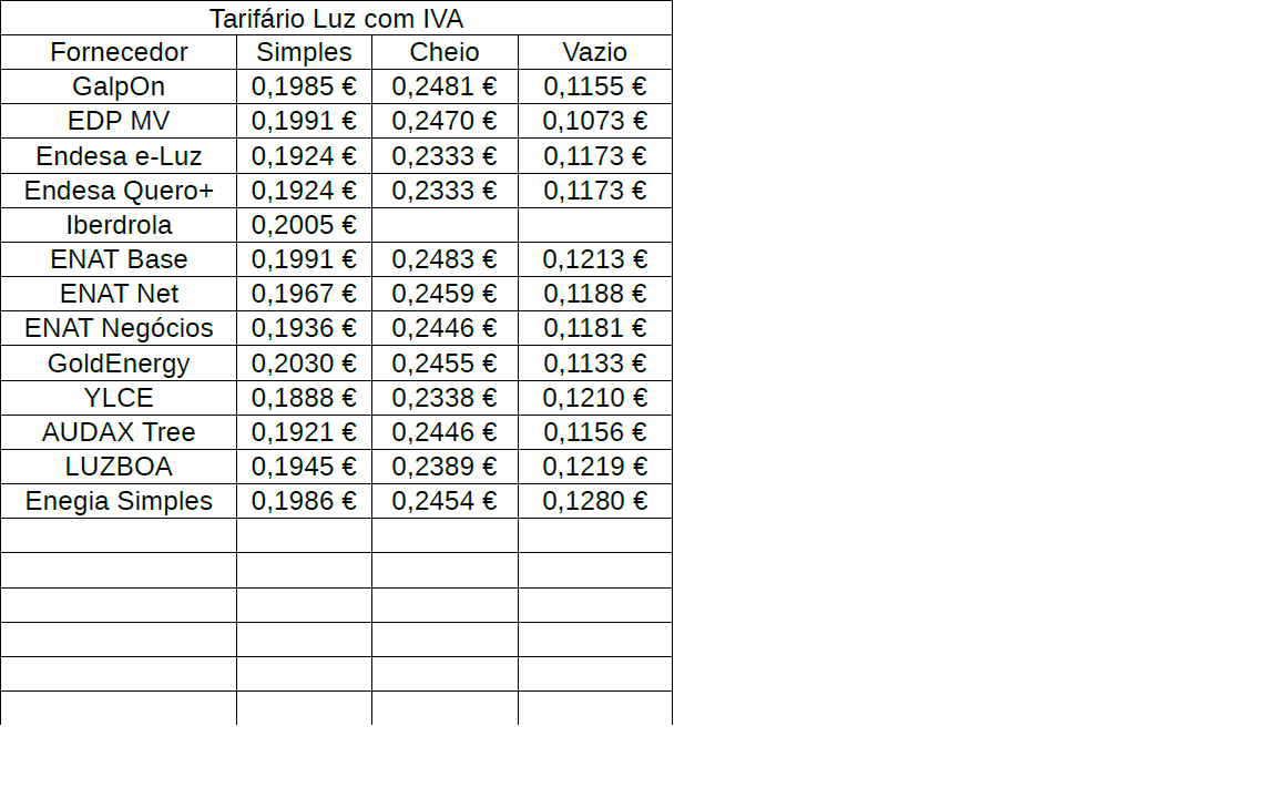 E criar uma tabela com os preços da eletricidade com as três tarifas, Simples, Cheio e Vazio.