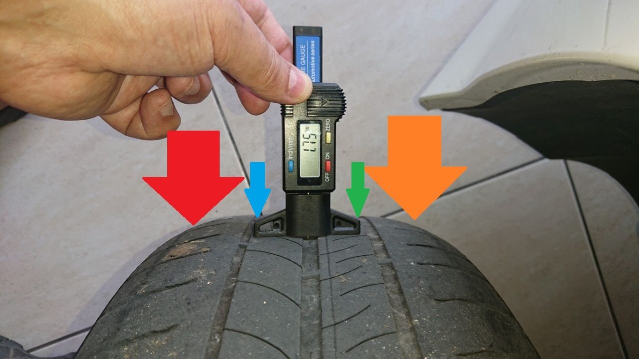 A deterioração do pneu parece ser consistente com o nivel de desgaste que o pneu aparenta ter nas partes laterais (setas vermelha e laranja).
