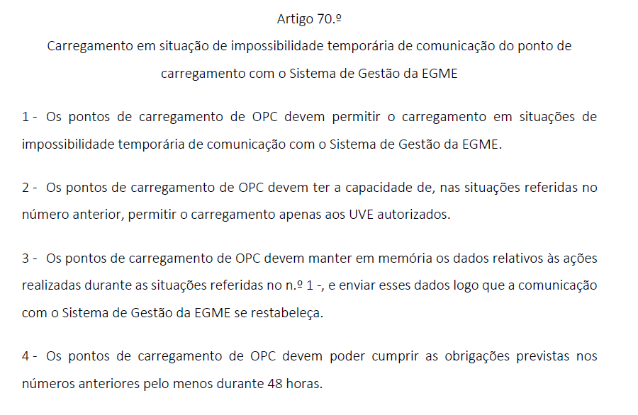 Foi pena terem sacudido a responsabilidade para os OPCs. Caso os postos não tenham memória para as dezenas de milhar (em breve centenas, espero) de IDs quem fica a falhar é o OPC e não a EGME. A proposta da UVE ao RME é que eventuais cartões não autorizados que carregassem fossem responsabilidade da EGME, tendo esta de pagar ao OPC a eletricidade e ser ela a tratar de reaver o dinheiro aos prevaricadores.