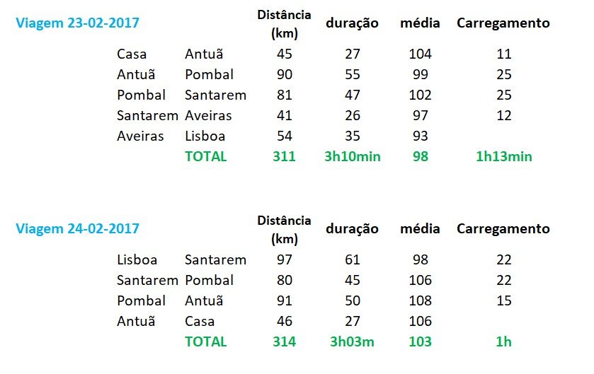 A deslocação seria de Alcabideche (Cascais) para a Zona Industrial da Maia. Utilizei como velocidade de referência 120Km/h, com 110 Km/h reduzia um pouco os tempos de carregamento. Em ambas indicava dois carregamentos, um em Leiria e outro na Mealhada num total de 51 minutos.