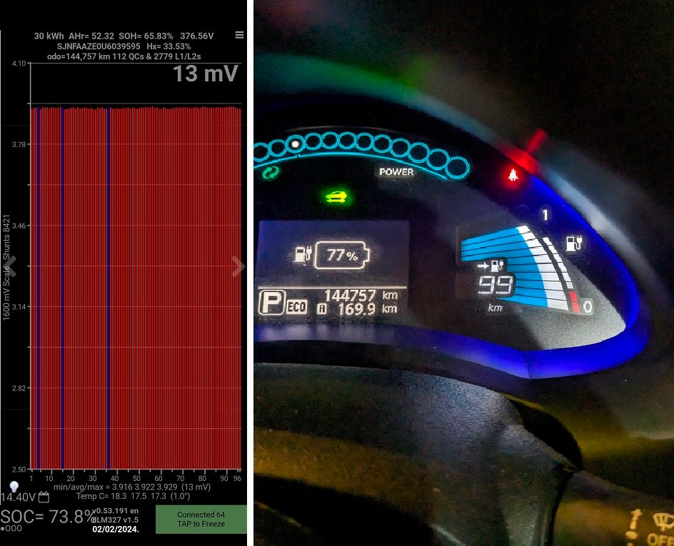 Começo a acreditar que o update de software da bateria trazia umas certas "regras" de guarda para garantir que o BMS era otimista o suficiente para não entalar a NISSAN, ou, talvez faça as contas pela energia carregada e não ligue nenhuma à energia descarregada. Isso justifica o SOH não cair
