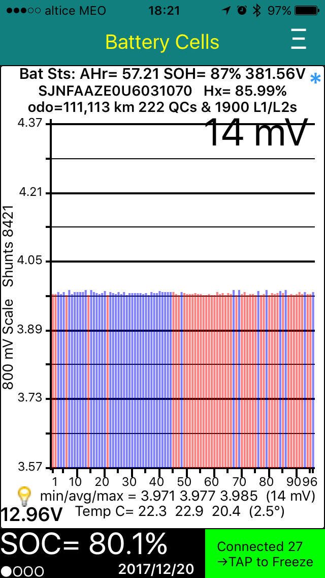 Pois Santanamos, O SOH já mexe e sou obrigado a considerar a hipótese que o LeafSpy esteve sempre a fazer a leitura correta. A ser verdade, não deixa de ser curioso,e interessantes interpretações que se poderão fazer a respeito da química das baterias que equipam os mk2. Mas, com humildade, devo reconhecer que temos poucos dados para validar uma tese mais sólida. Se continuarmos a registar fenómenos idênticos noutras combinações Leaf mk2, LSpy e ambiente IOS, talvez se possa formular teorias mais sólidas. Para já, embora preferisse o habitual numero 95, estou contente por passar a ter mais mais confiança num indicador tão óbvio da degradação, como é o SOH!