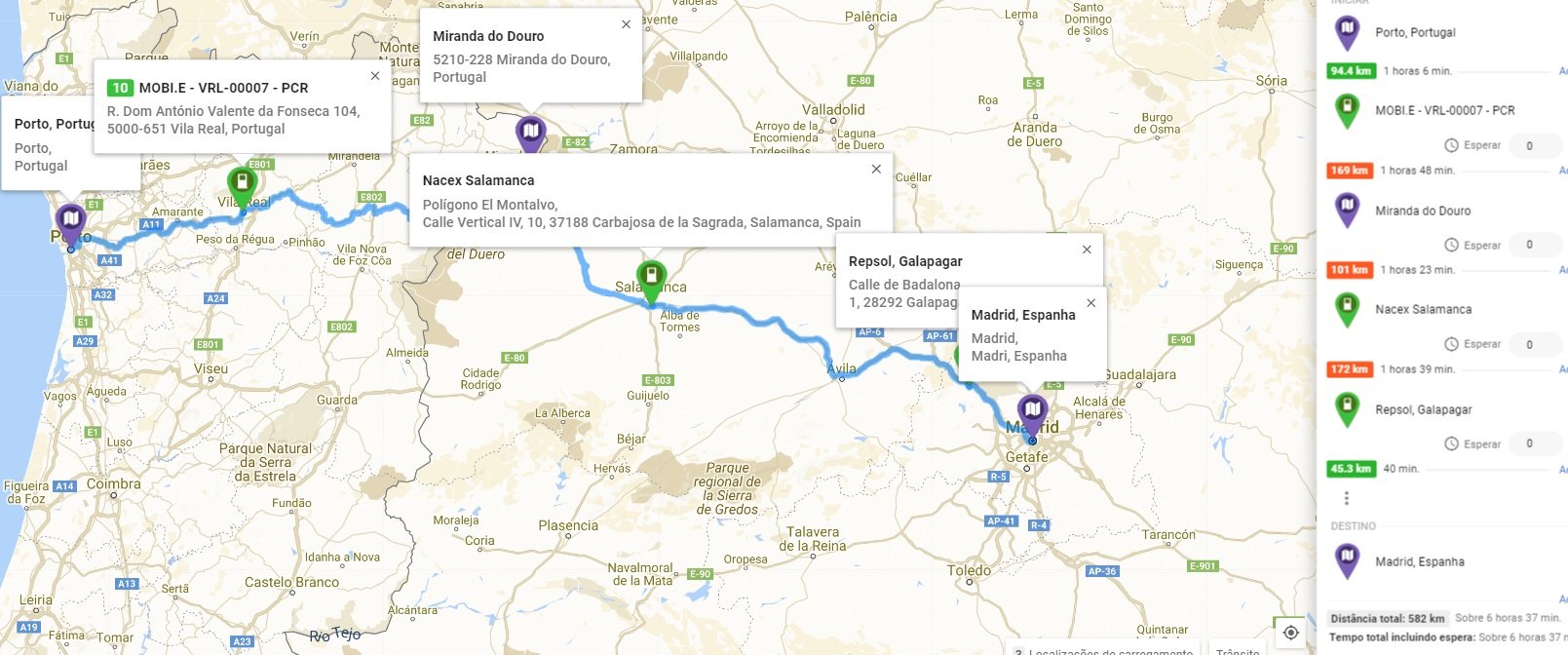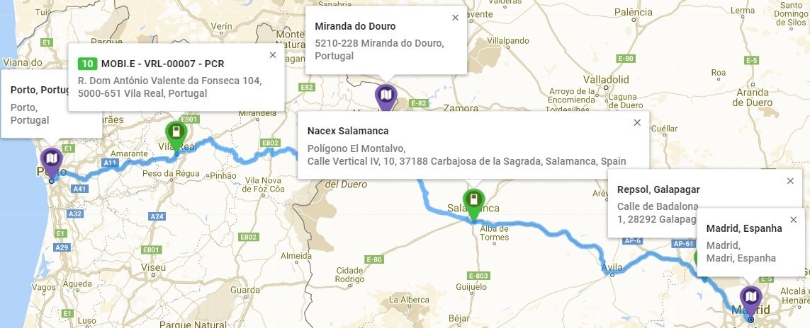O trajeto que sugiro, com uma dormida, só poderá ocorrer "rapidgate" no segundo carregamento em Espanha, perto de Madrid.