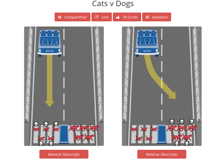 Nesta situação o carro autonomo que fica sem travões de repente e só consegue decidir seguir em frente ou desviar para a outra faixa de rodagem quem mataria? Os caes ou os gatos lol!